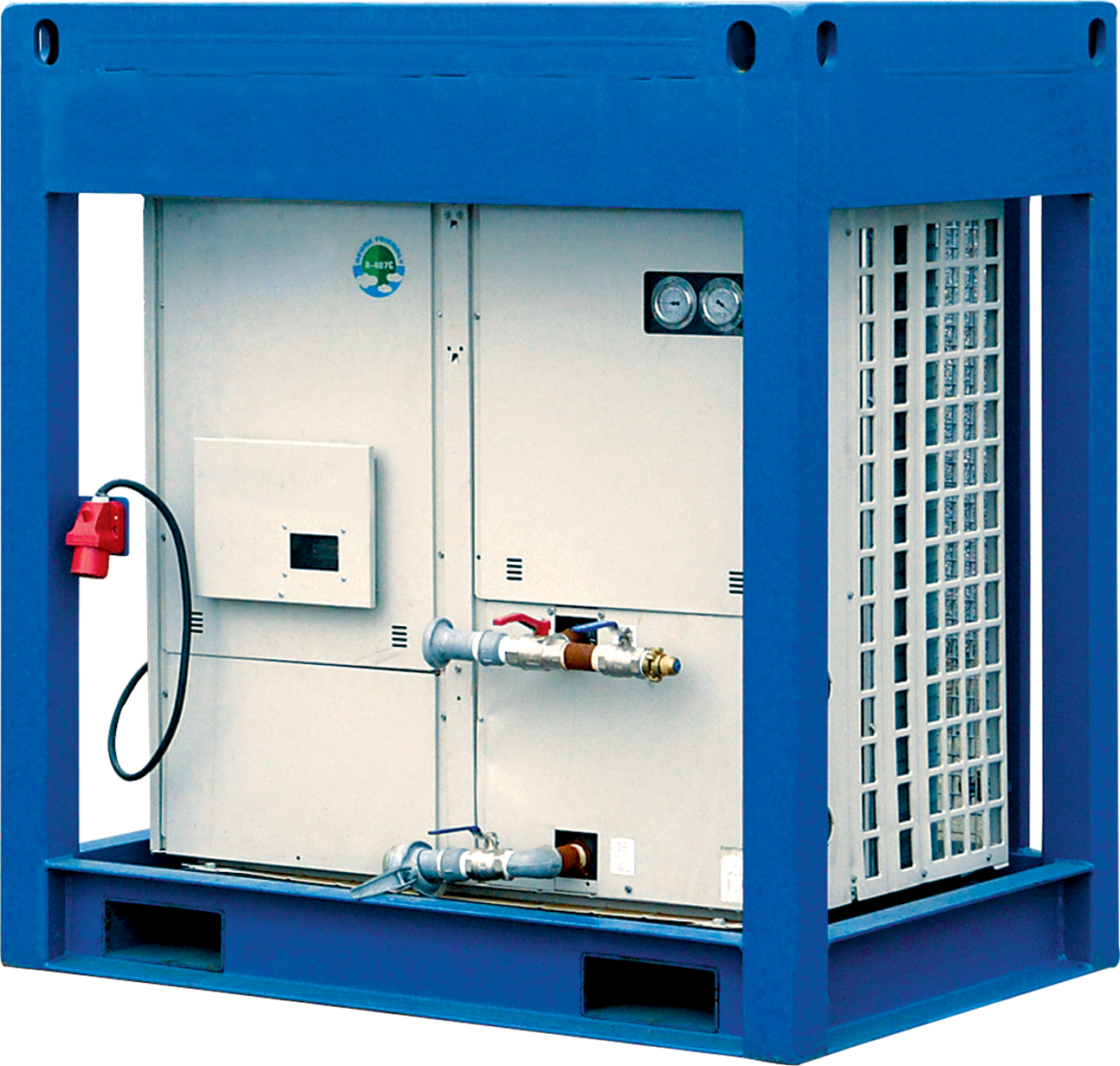 Luftgekühlter Kaltwassersatz (Chiller), Kälteleistung 25 kW, mit eingebauter Wasserpumpe und Ausgleichsbehälter. Der Kaltwassersatz ist energiesparend, betriebsfertig und hat einen niedrigen Schallpegel. Der Kaltwassersatz ist in einen stabilen Rahmen eingebaut. Der Kondensator ist durch ein stossfestes Gitter geschützt. Mit einem Stapler oder Kran lässt sich die Kältemaschine einfach versetzen.