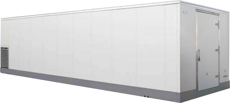 Mobile Fertigtiefkühlzelle mit einem Volumen von 100 m³ und einer grossen Kühlleistungsüberkapazität (Temperaturbereich bis minus 35 °C). Die Tiefkühlzelle ist mit einem flachen rutschfesten Boden und Beleuchtung ausgestattet. Die Tür hat eine sehr niedrige Einstiegshöhe und lässt sich dank der Rahmenheizung leicht öffnen – auch von innen.Die Kühlzelle erfüllt die HACCP/GMPAnforderungen und verfügt serienmäßig über einen Datenlogger. Sie lässt sich mit einem Kran-LKW einfach aufstellen, auch an schwer zugänglichen Stellen, sowohl drinnen als auch draussen. Die Tiefkühlzelle ist energiesparend und hat einen niedrigen Schallpegel. Auch in redundanter Ausführung erhältlich.