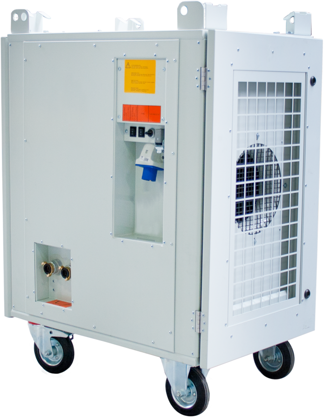 Kompaktes mobiles und aufhängbares Lüftungsgerät mit einer Heizleistung von 50 kW und einer Kälteleistung von 25 kW. Das energiesparende Gerät lässt sich einfach an einen Luftschlauch oder ein Leitungssystem anschließen. Die Temperaturregelung erfolgt über Fernbedienung oder über den eingebauten Thermostat. Verwendungszweck: Bringt kleine bis mittelgroße Räume auf die richtige Temperatur bzw. hält die Temperatur oder hält größere Gebäude frostfrei.