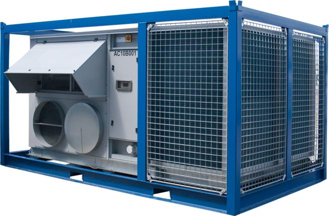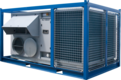 Luftgekühltes Klimagerät / Wärmepumpe mit sehr niedrigem Schallpegel und Kühl- und Heizleistung von 106 kW. Dieses energiesparende Gerät kann im Sommer wie im Winter benutzt werden. Durch die betriebsfertige Ausführung lässt es sich einfach installieren und bedienen. Das Klimagerät ist in einen stabilen Rahmen eingebaut. Der Kondensator ist durch ein stoßfestes Gitter geschützt. Mit einem Stapler oder Kran lässt sich die Maschine einfach versetzen.