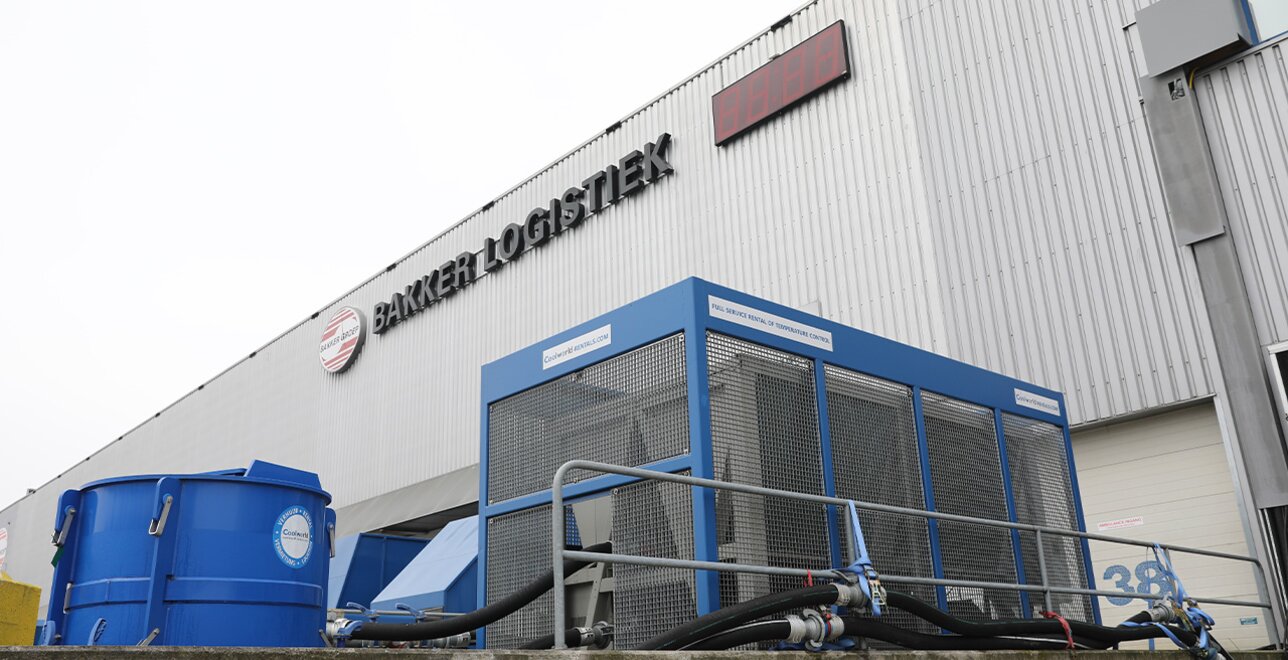 300-kW-Chiller und Low-Temp-Lüftungsgeräte mit Pumpe und Stromversorgung. Zwischen den Verladedocks des umfangreichen Logistikkomplexes in Zeewolde standen der 300-kW-Chiller einschließlich Puffertank, Pumpe und dem erforderlichen Zubehör. Drinnen standen die daran angeschlossenen vier großen Low-Temp-Lüftungsgeräte. Diese Lüftungsgeräte standen auf einem Podest nebeneinander.