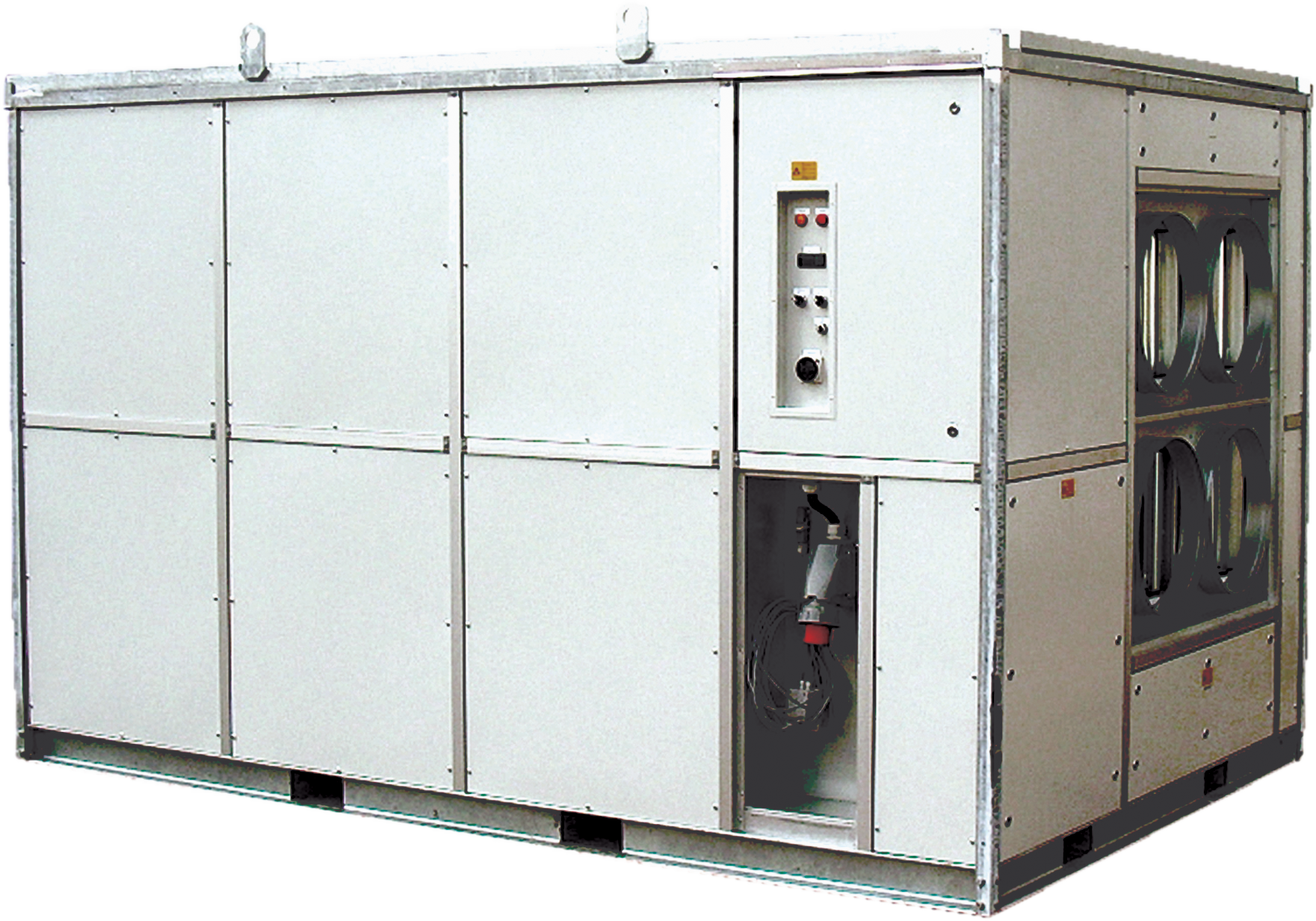Unité de ventilation refroidie par eau et peu bruyante, d’une puissance frigorifique de 200 kW. Équipée d’un ventilateur renforcé à grand débit d’air. Prête à brancher et simple à installer grâce aux raccords rapides. Facile à déplacer avec un chariot élévateur ou une grue.