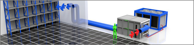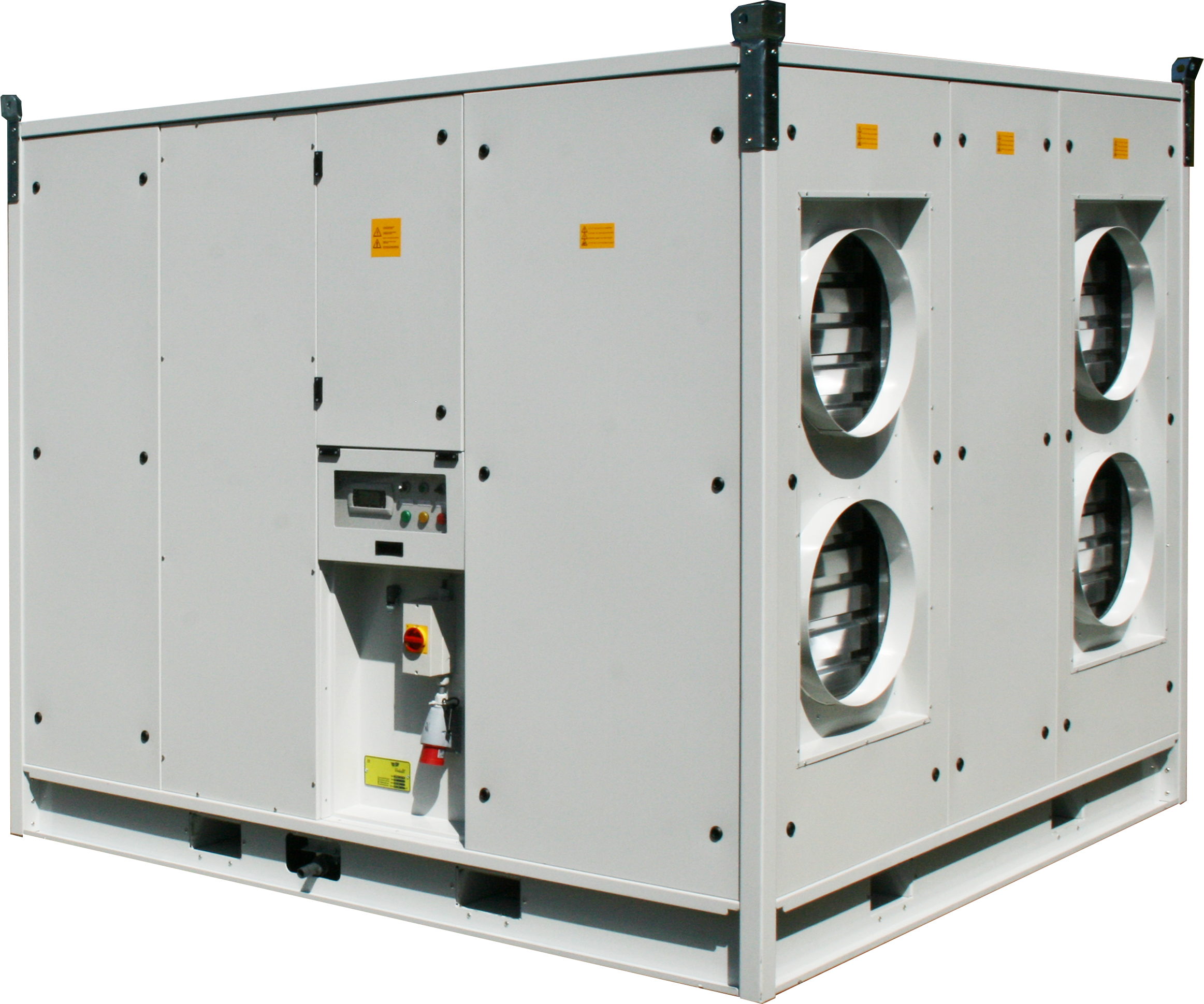 Unité de ventilation Eurovent, économe en énergie, classe A, à refroidissement par eau, d'une puissance frigorifique de 340 kW, équipée d'un ventilateur extra puissant pour longue portée d'air. L'Unité est prête à brancher et simple à installer grâce à l'utilisation de raccords rapides.