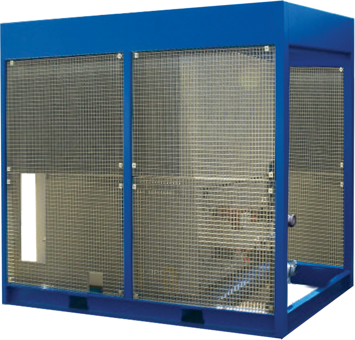 Luchtgekoelde koudwatermachine (chiller) met een koelvermogen van 100 kW. De machine is energiezuinig, geluidsarm en stekkerklaar. De machine is gebouwd in een robuust frame met bescherming van de condensor door een stootvast rooster en is eenvoudig met heftruck of kraan te verplaatsen.