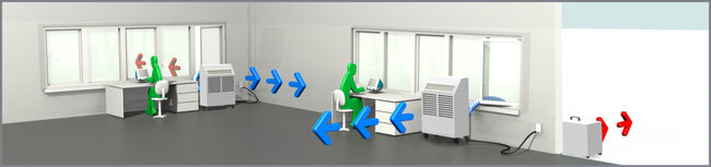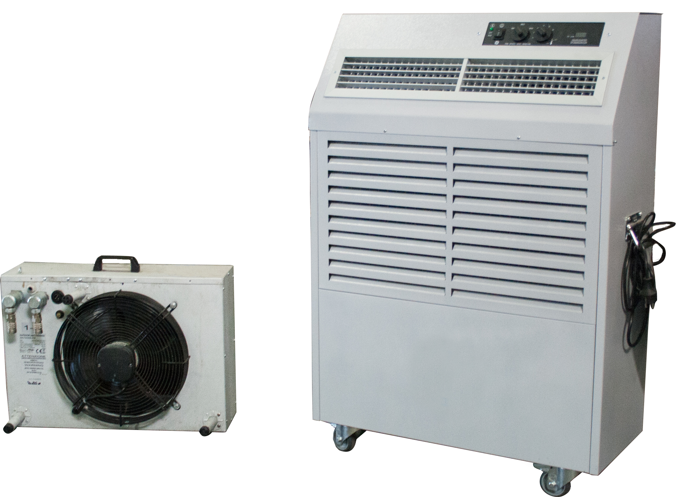 Presentable, whisper-silent mobile air conditioner with a 6.6 kW cooling capacity. Despite its high cooling capacity, it only requires a 230 V power supply. The unit is ready for use and features a condenser unit that must be installed outside the cooling space for heat drain. (split system).