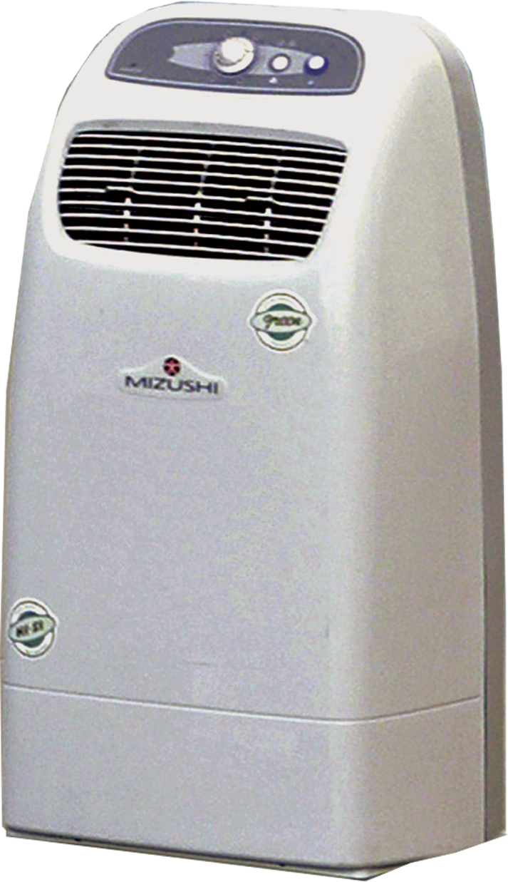 Presentable, whisper-silent mobile Mizushi air conditioner with a 2.2 kW cooling capacity. The unit is ready for use and features a flexible exhaust hose for heat drain.