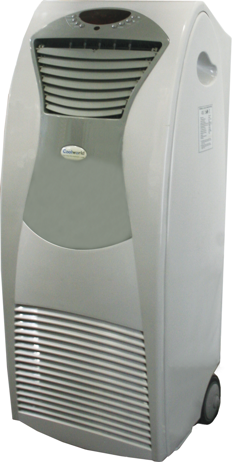 Presentable, whisper-silent mobile Coolworld air conditioner with a 4.4 kW cooling capacity. The unit is ready for use and features a flexible exhaust hose for heat drain and condensation discharge.