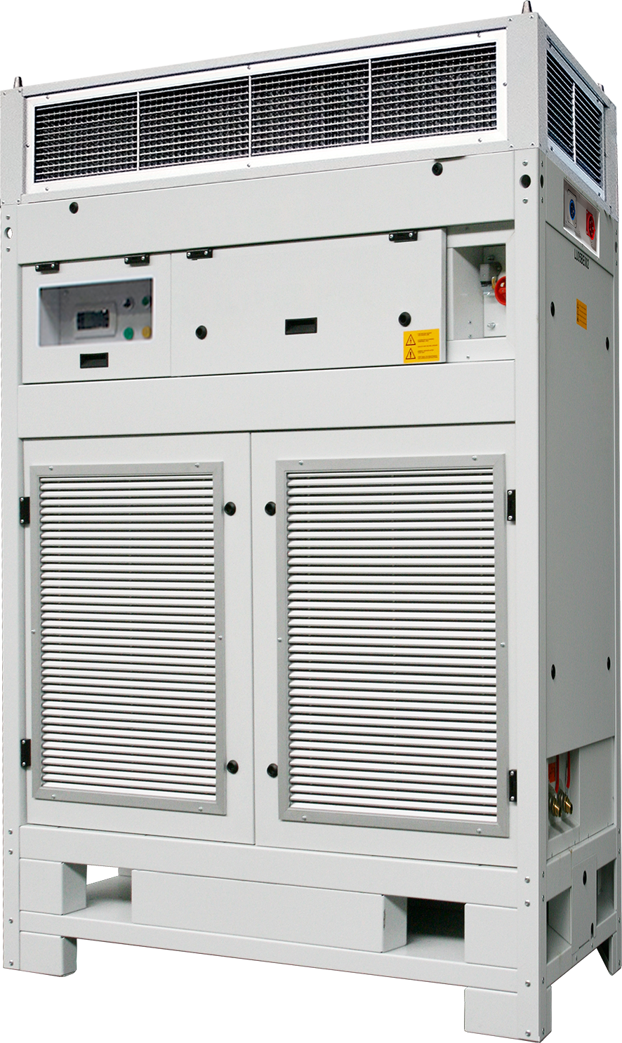Low-noise water-cooled ventilation unit with a 50 kW cooling capacity, fitted with continuously variable ventilation control that can blow in three directions. The airhandler is equipped with an extra defrost element which makes it also suitable for low temperature applications. For electrical defrosting a 32 A CEE connection is required. The unit is equipped with a condensate pump, ready for connection and easy to install by using shortcuts. The unit is easy to move with a pallet cart or forklift.