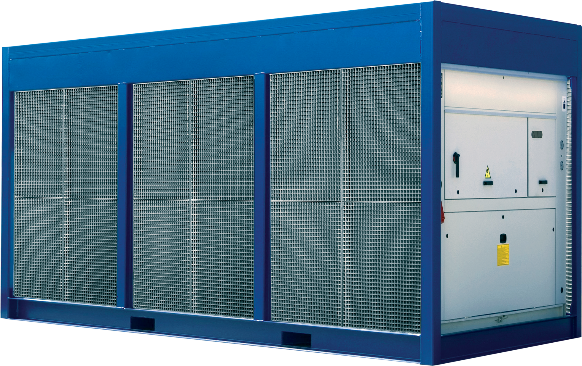 Air-cooled chiller with 200 kW cooling capacity. This low-energy low-noise machine is ready for use. The machine is mounted in a robust frame with a shock-resistant grid for condenser protection and can be moved easily with a forklift or crane.