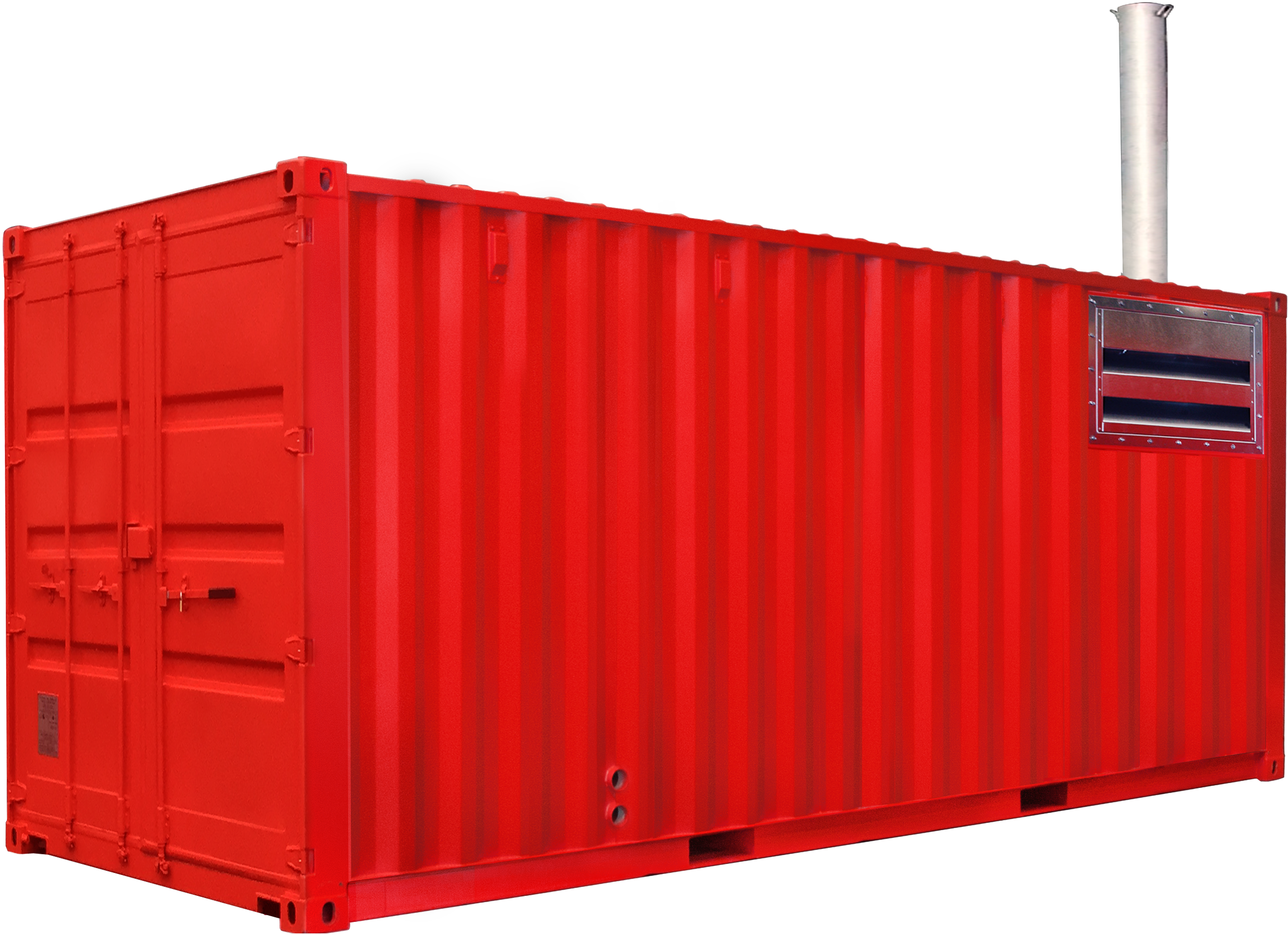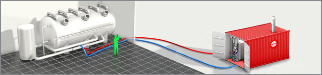 Gas- or diesel-fired mobile boiler room with a heating capacity of 1,000 kW installed in a robust steel heating container. The powerful and compact unit is easy to install. The mobile industrial boilers provide water temperatures of up to 90 °C and pressures of up to 6 bar. The efficient boiler features various safety facilities, frost protection, low NOx burners, smart control technology and has the lowest emissions, energy consumption and noise levels in the European market.